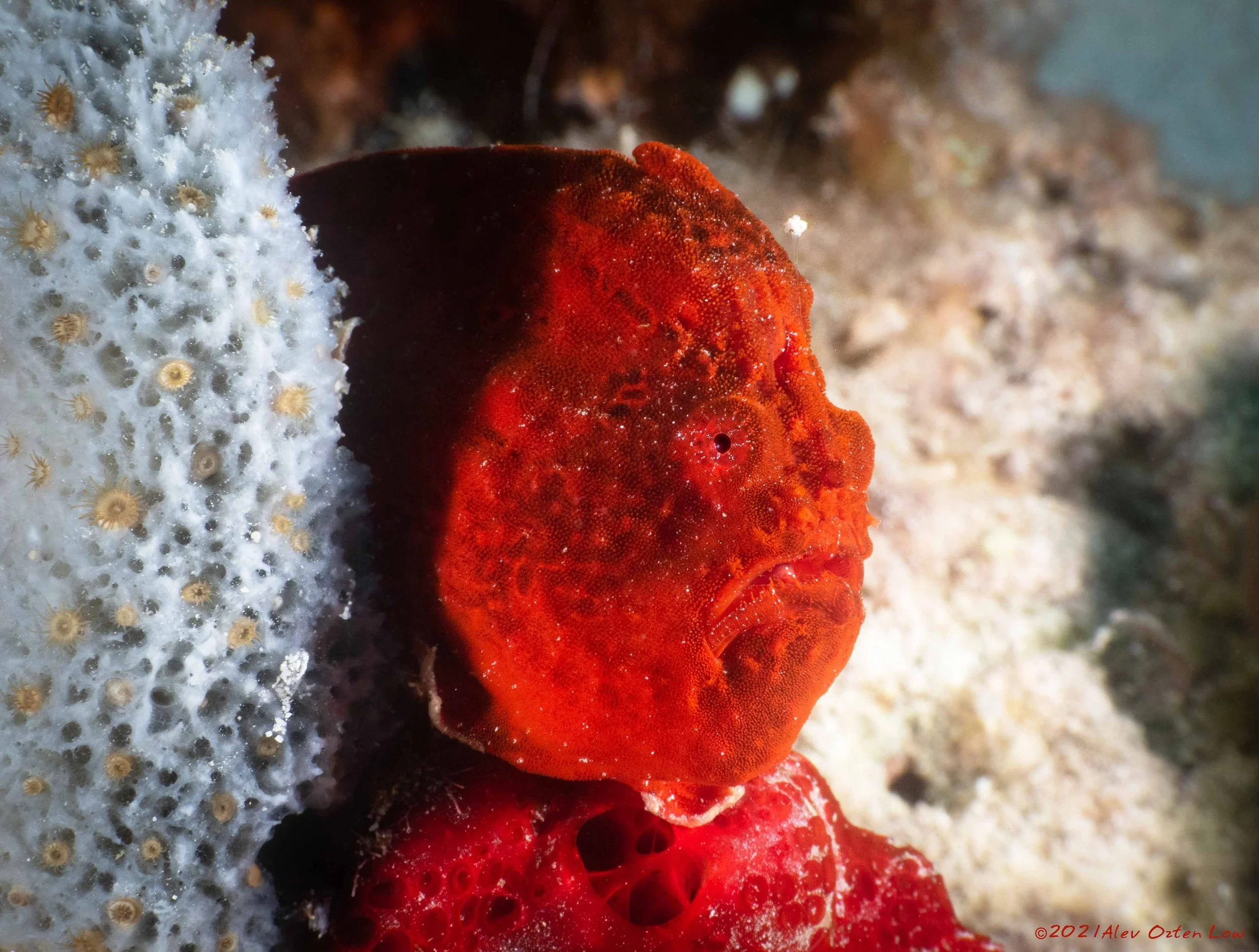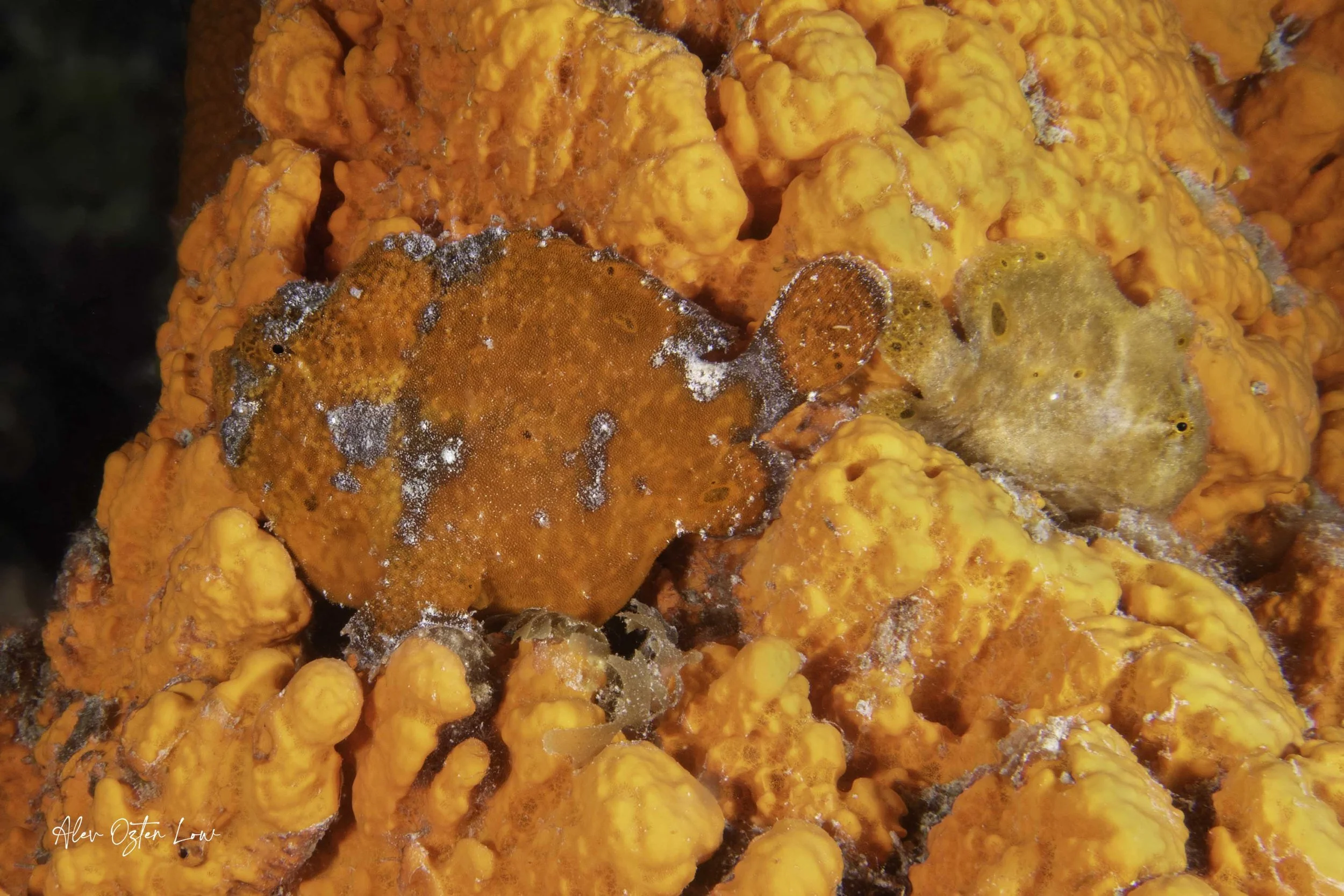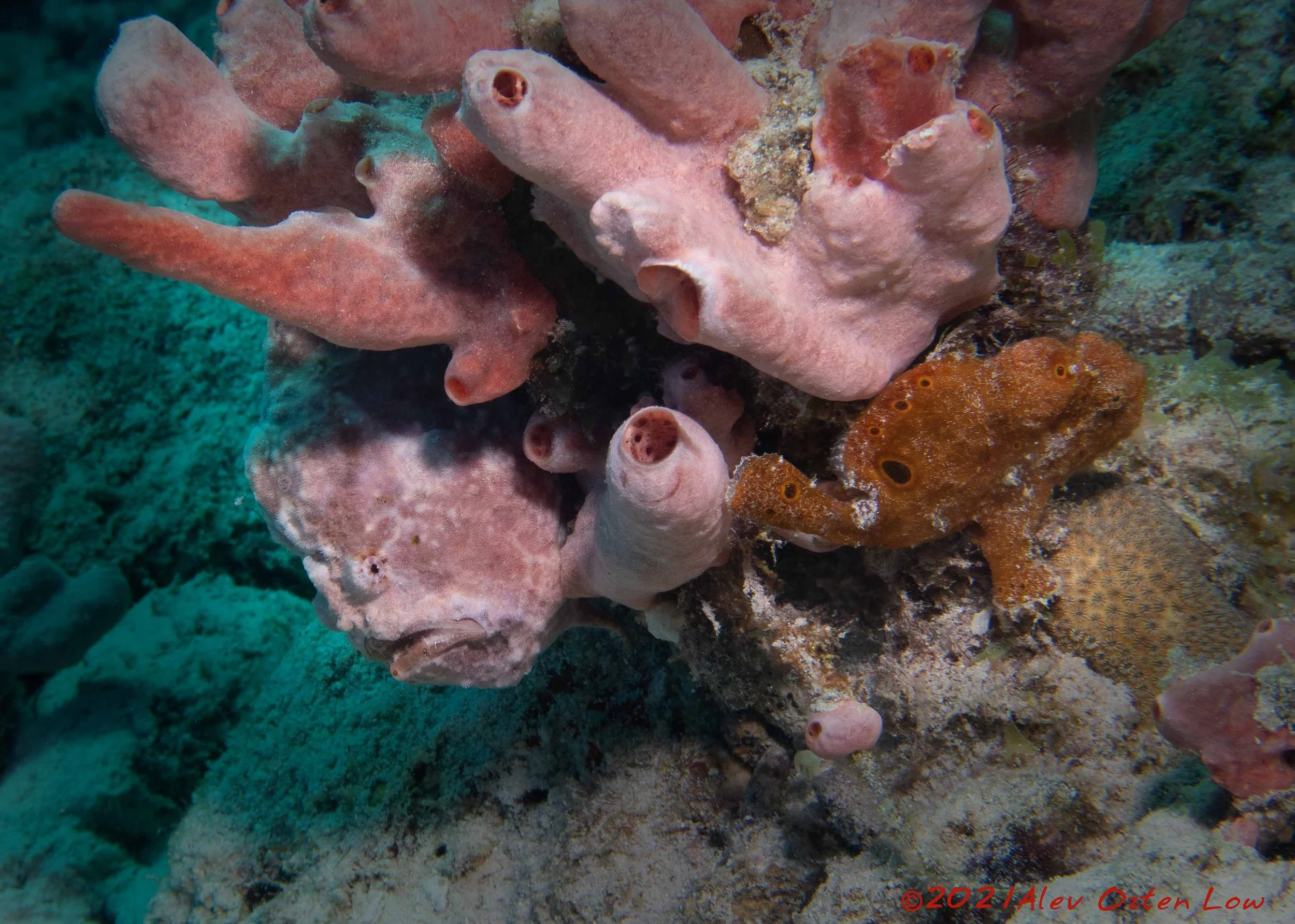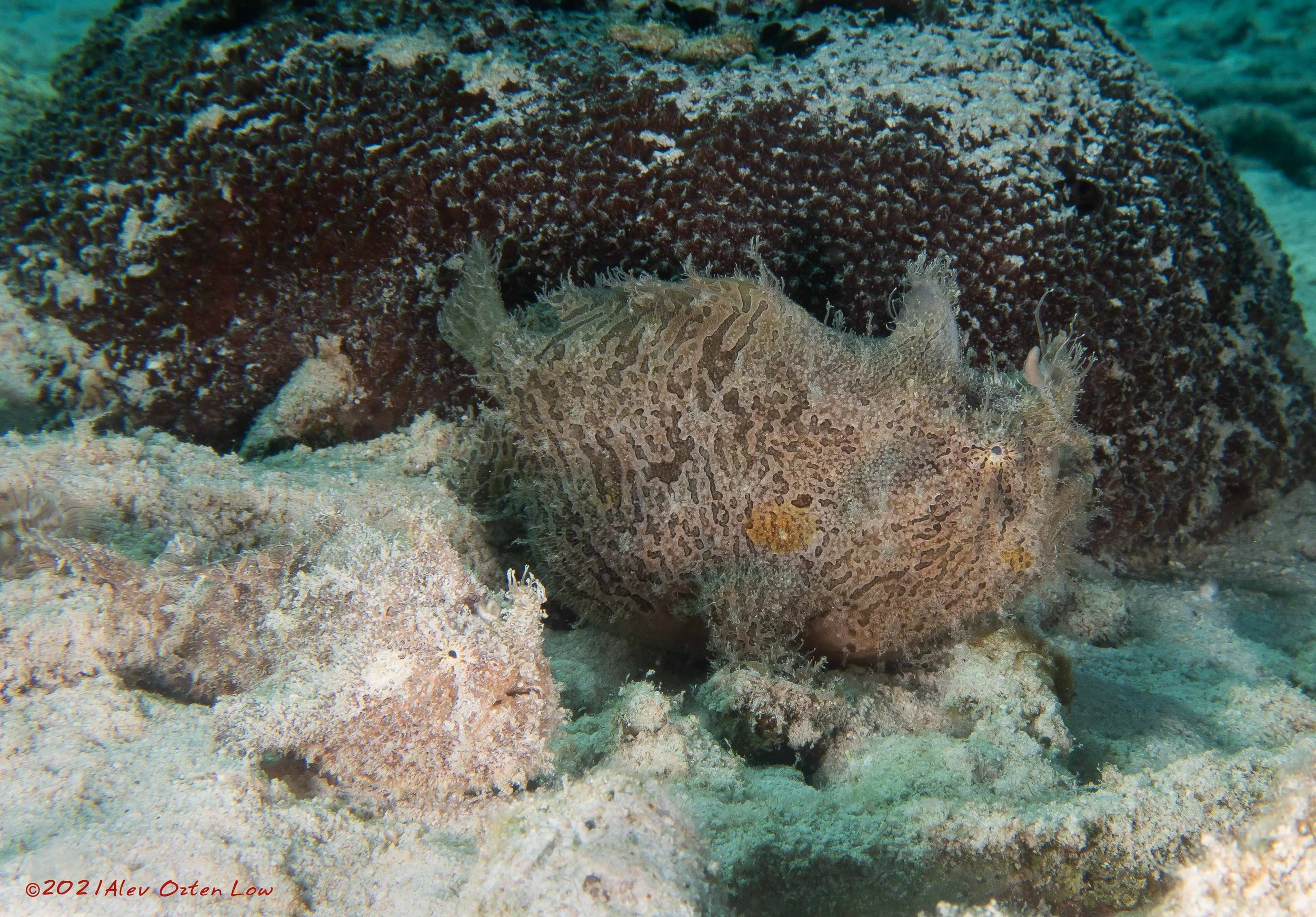 Longlure Frogfish PAIR (Antennarius multiocellatus) - Can you see them both? The large one is likely the female. Males tend to be the smaller of the two. I have a VIDEO of these two where the female is being followed by the male. Check out my youtube channel.
