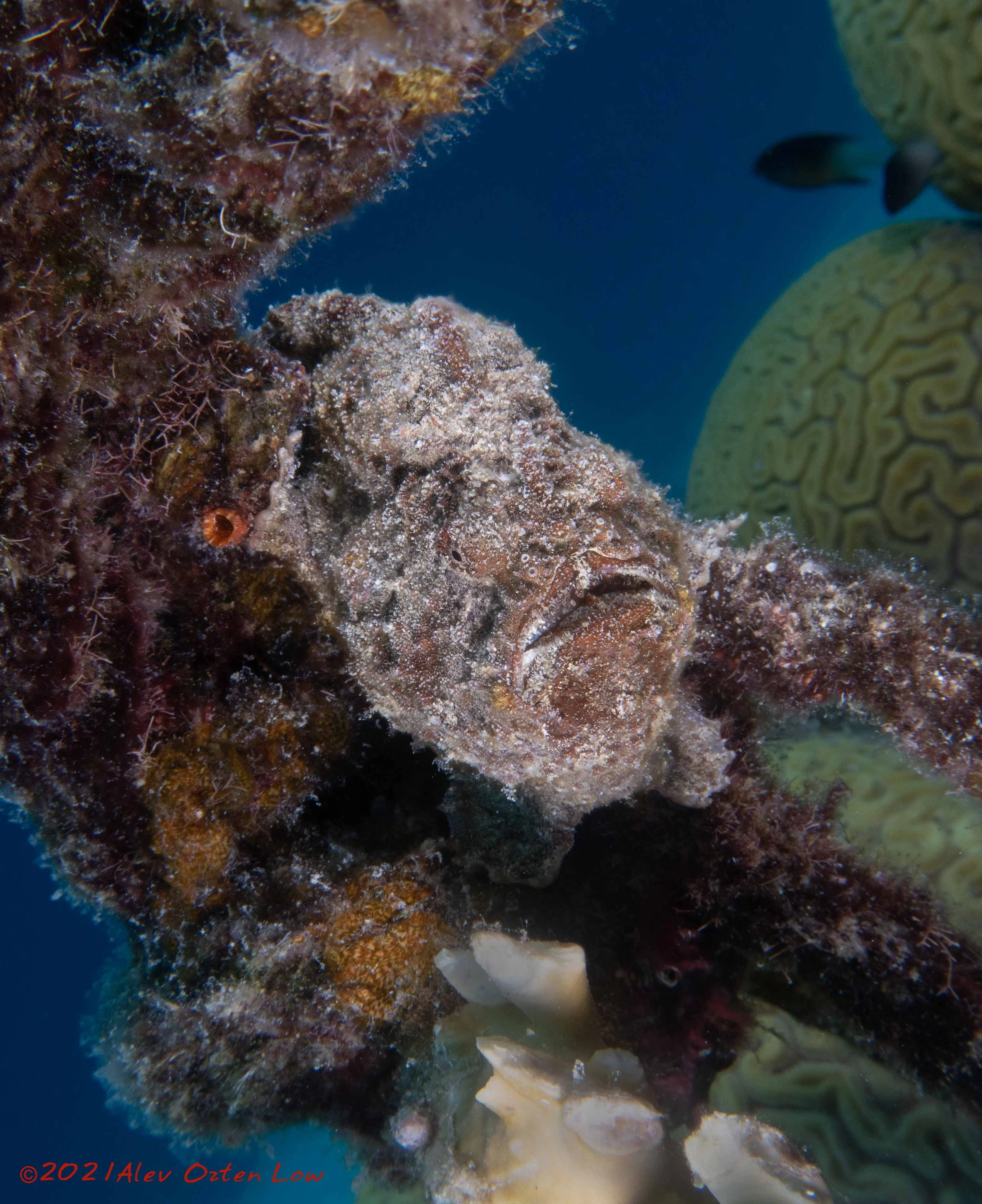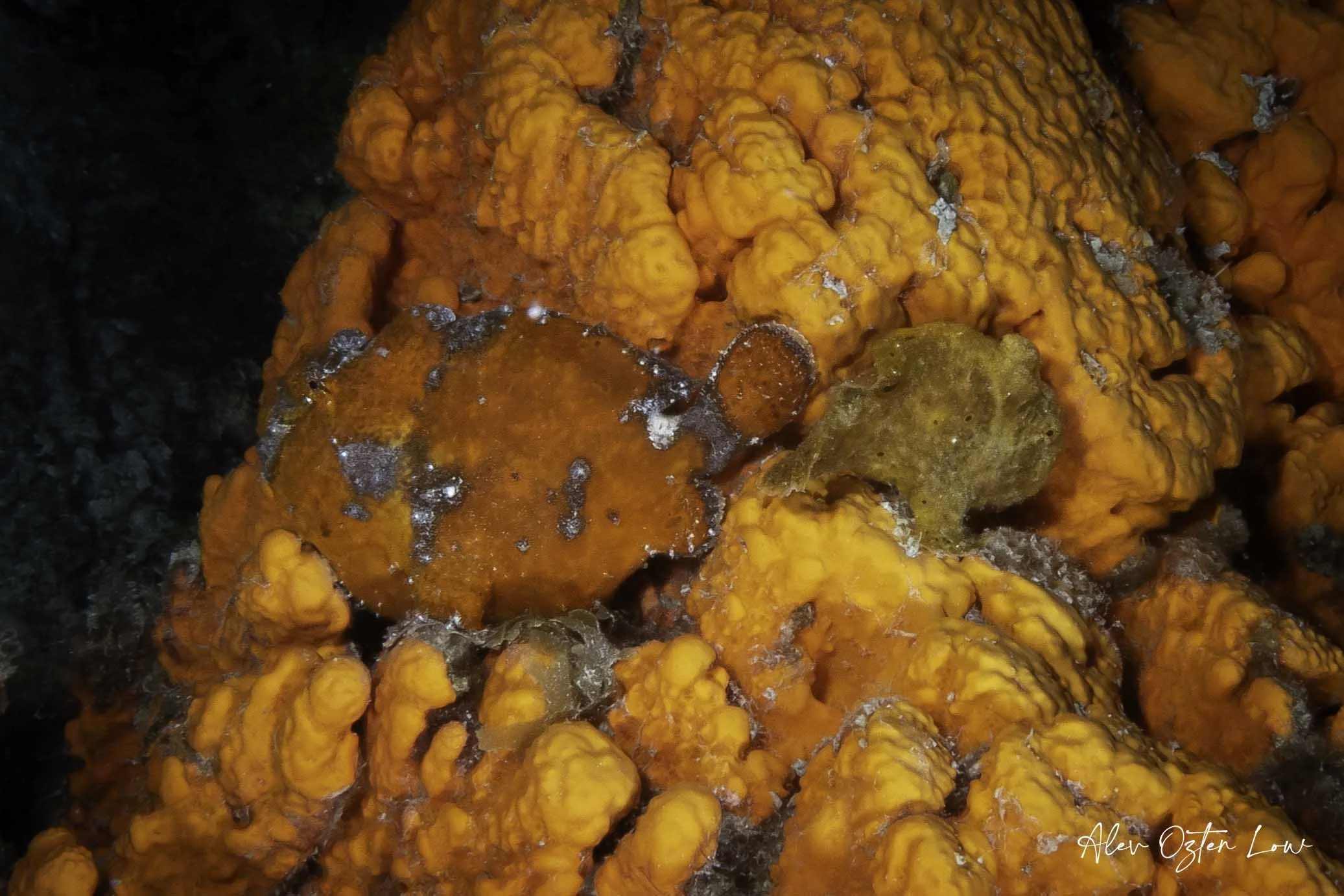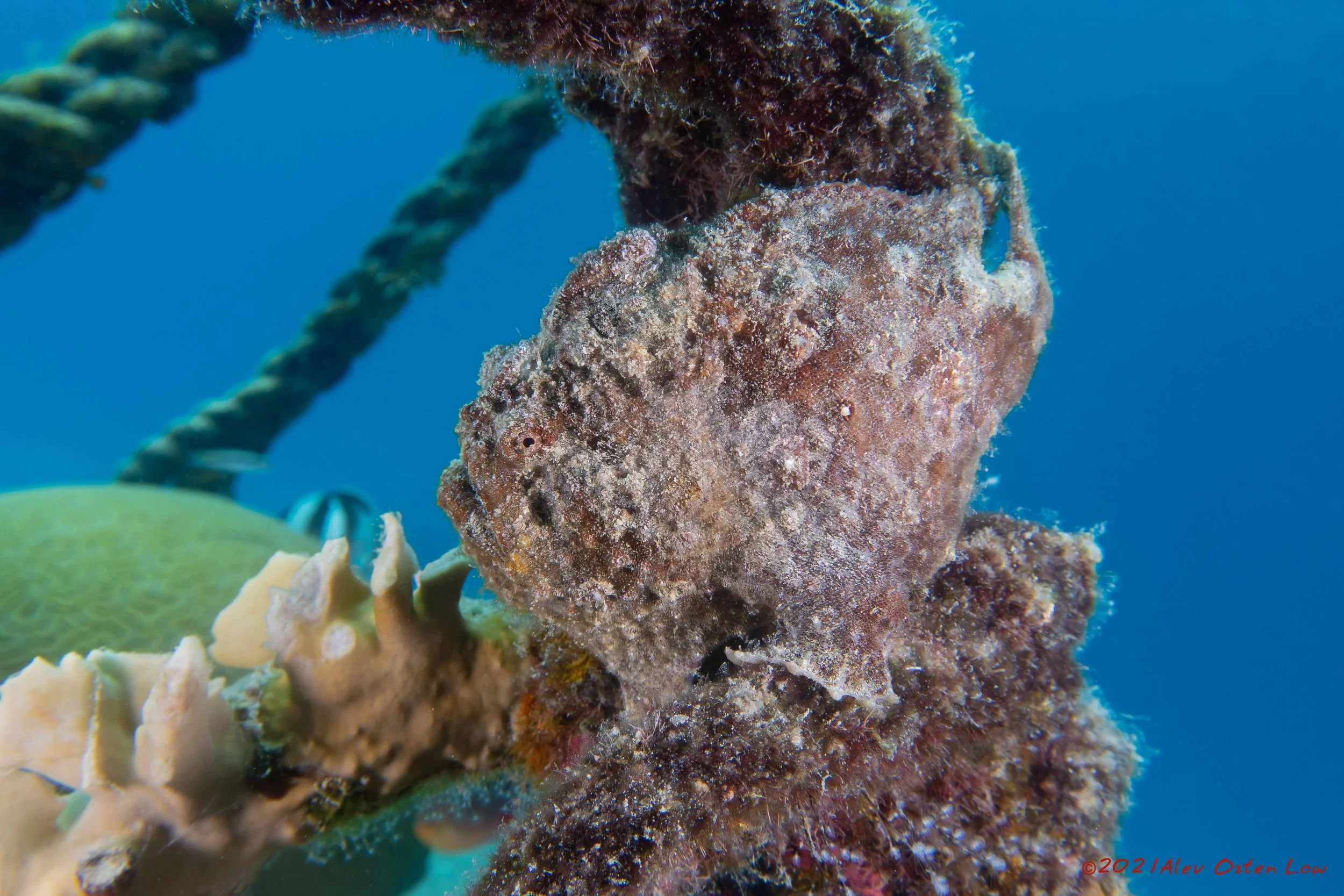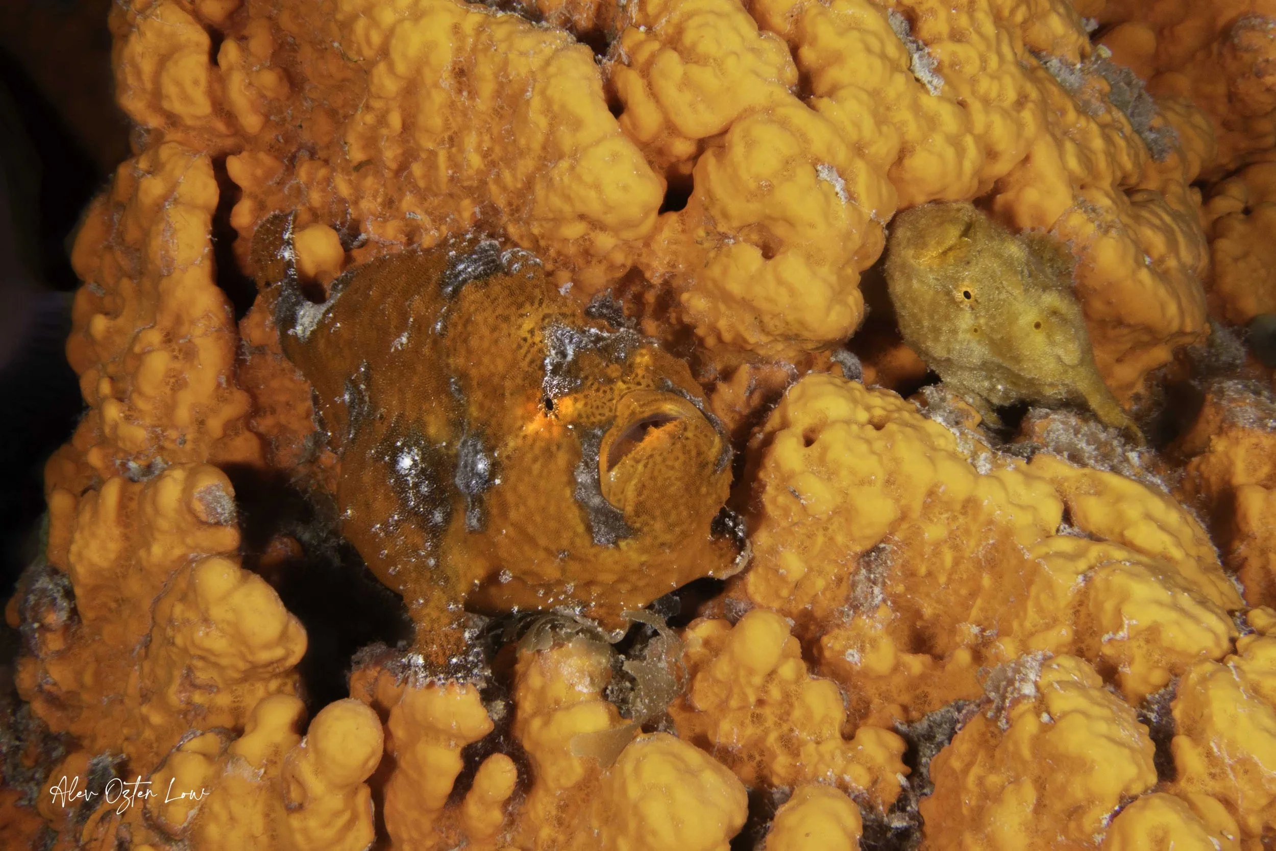 Longlure Frogfish PAIR (Antennarius multiocellatus) - Can you see them both? The large one is likely the female. Males tend to be the smaller of the two. I have a VIDEO of these two where the female is being followed by the male. Check out my youtube channel.