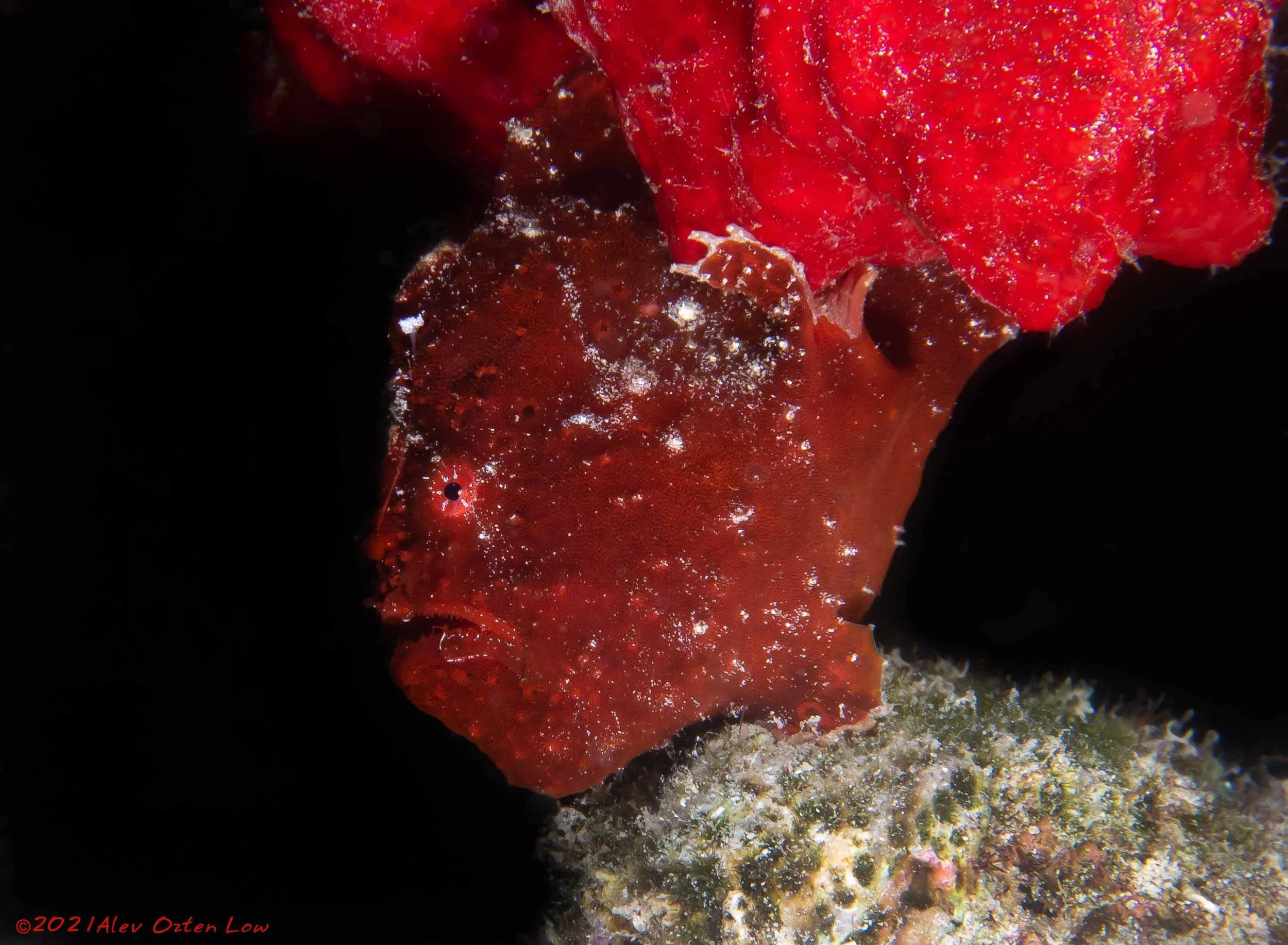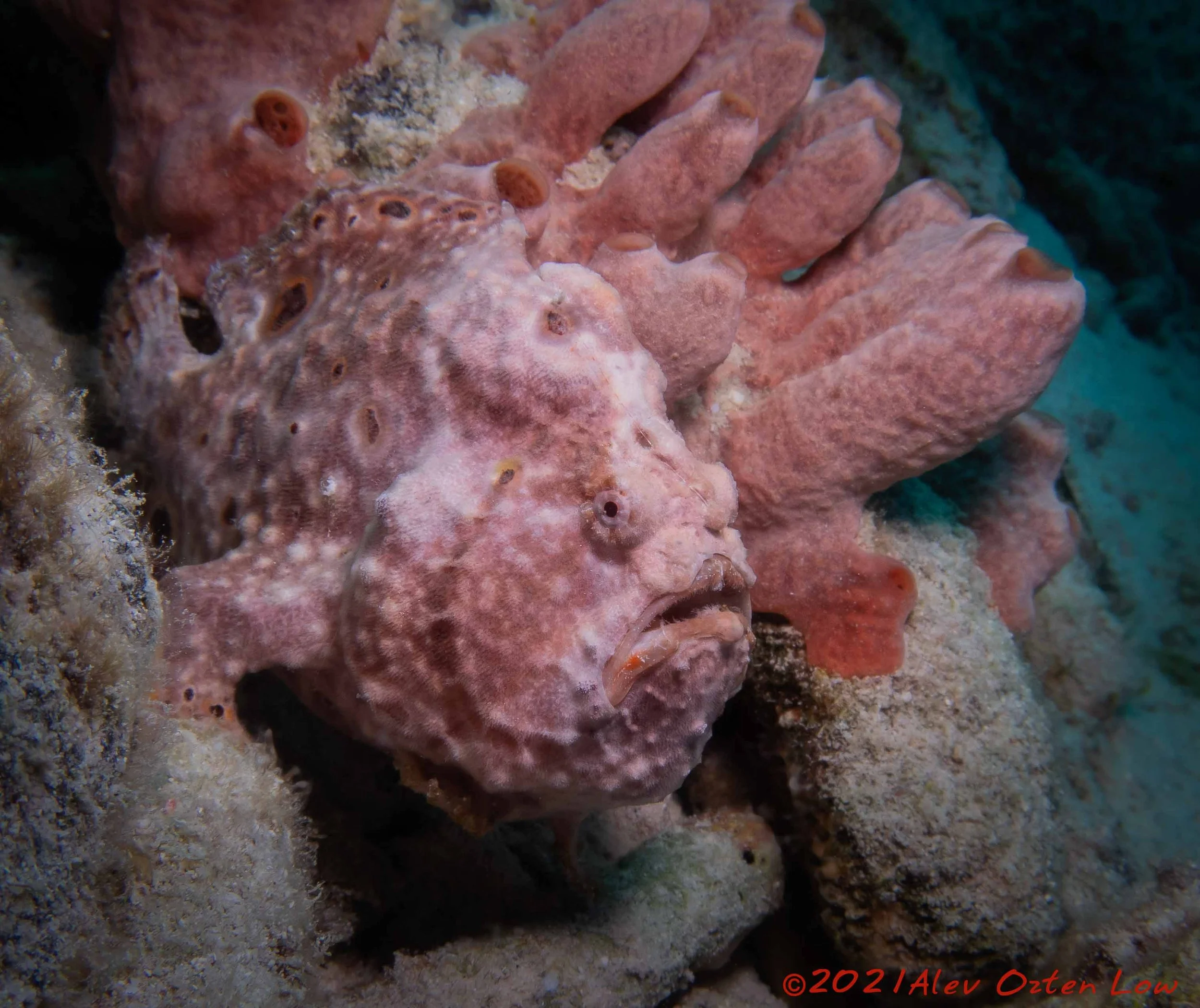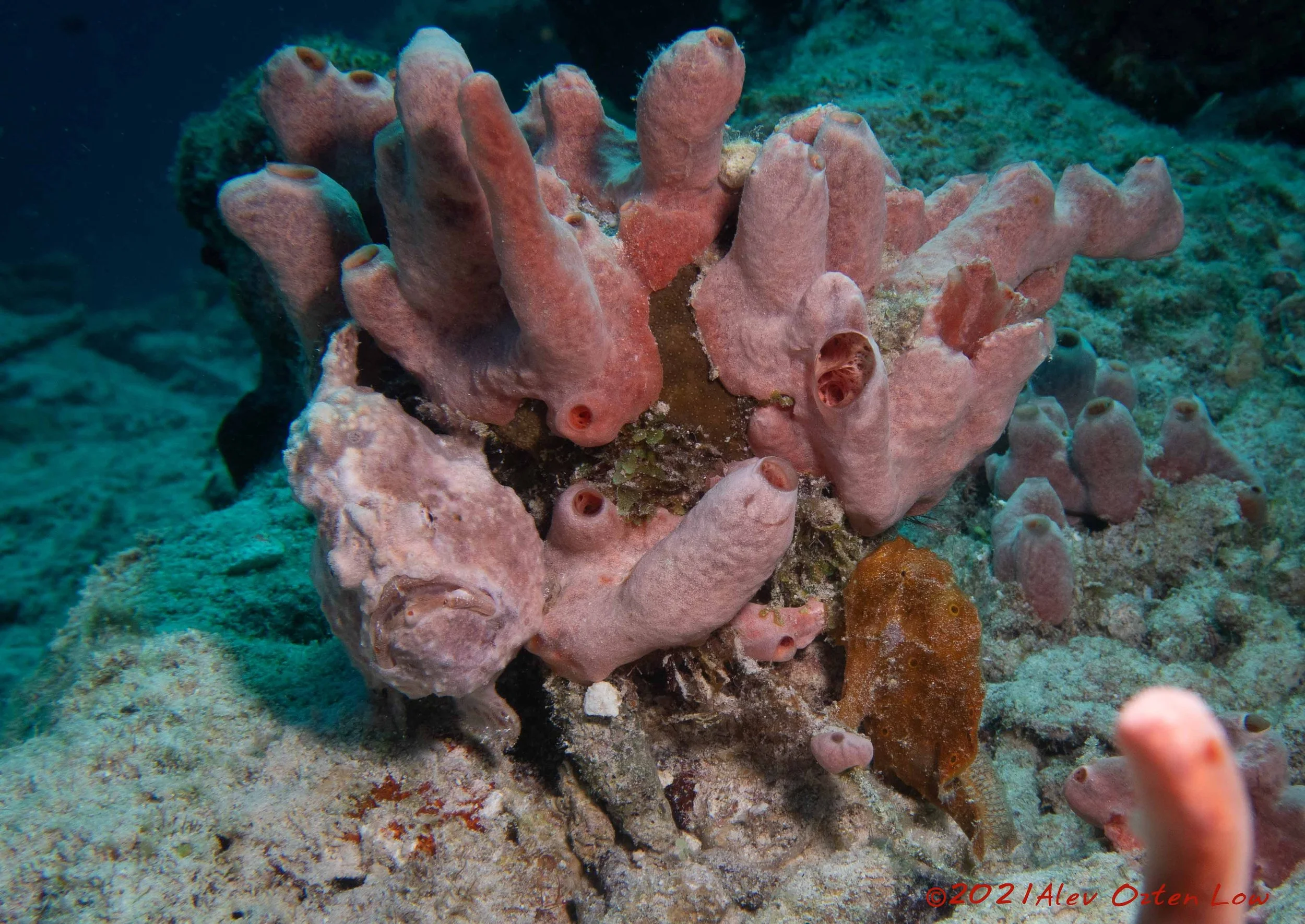 Longlure Frogfish PAIR (Antennarius multiocellatus) - Can you see them both? The male (smaller on the right) followed the female (pink large one) for quite some time. WATCH VIDEO ON YOUTUBE