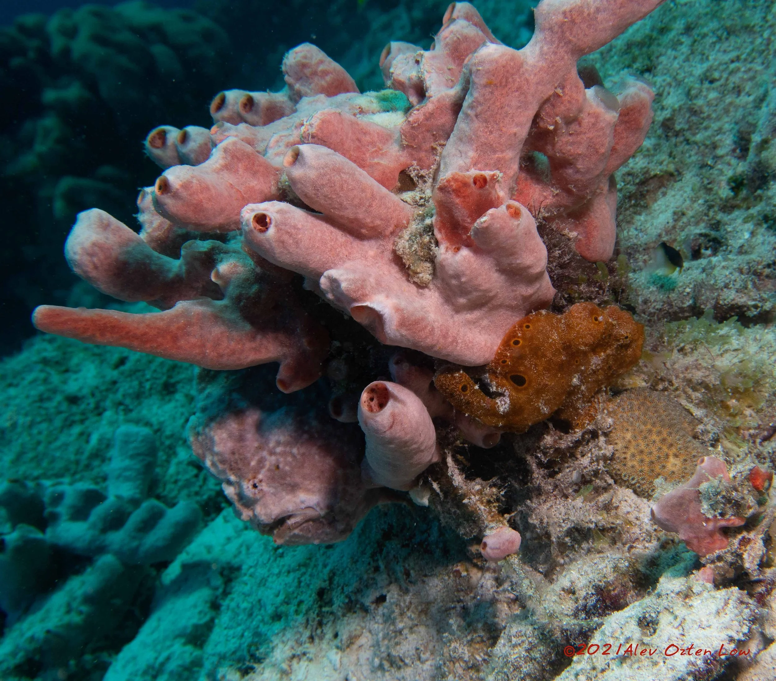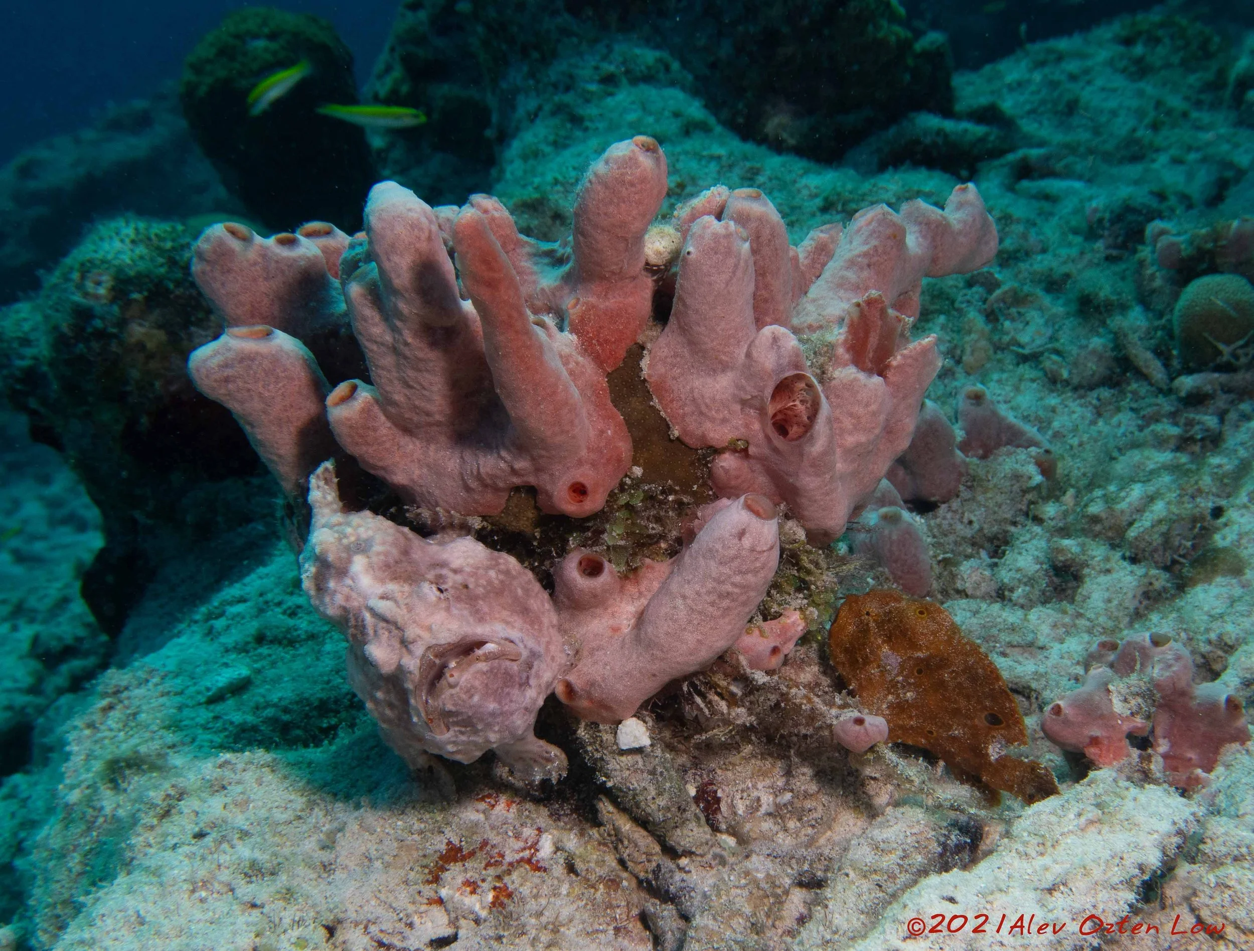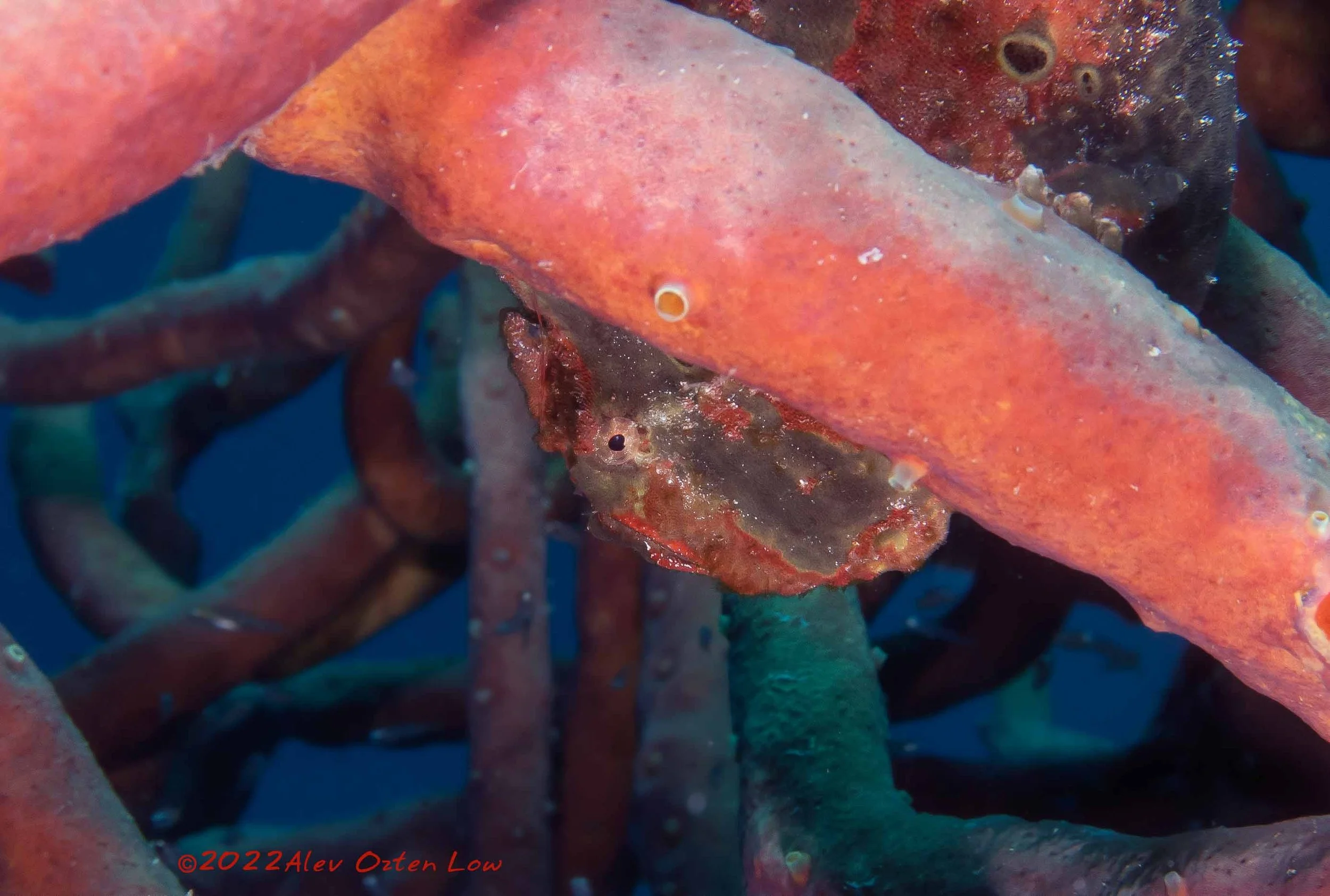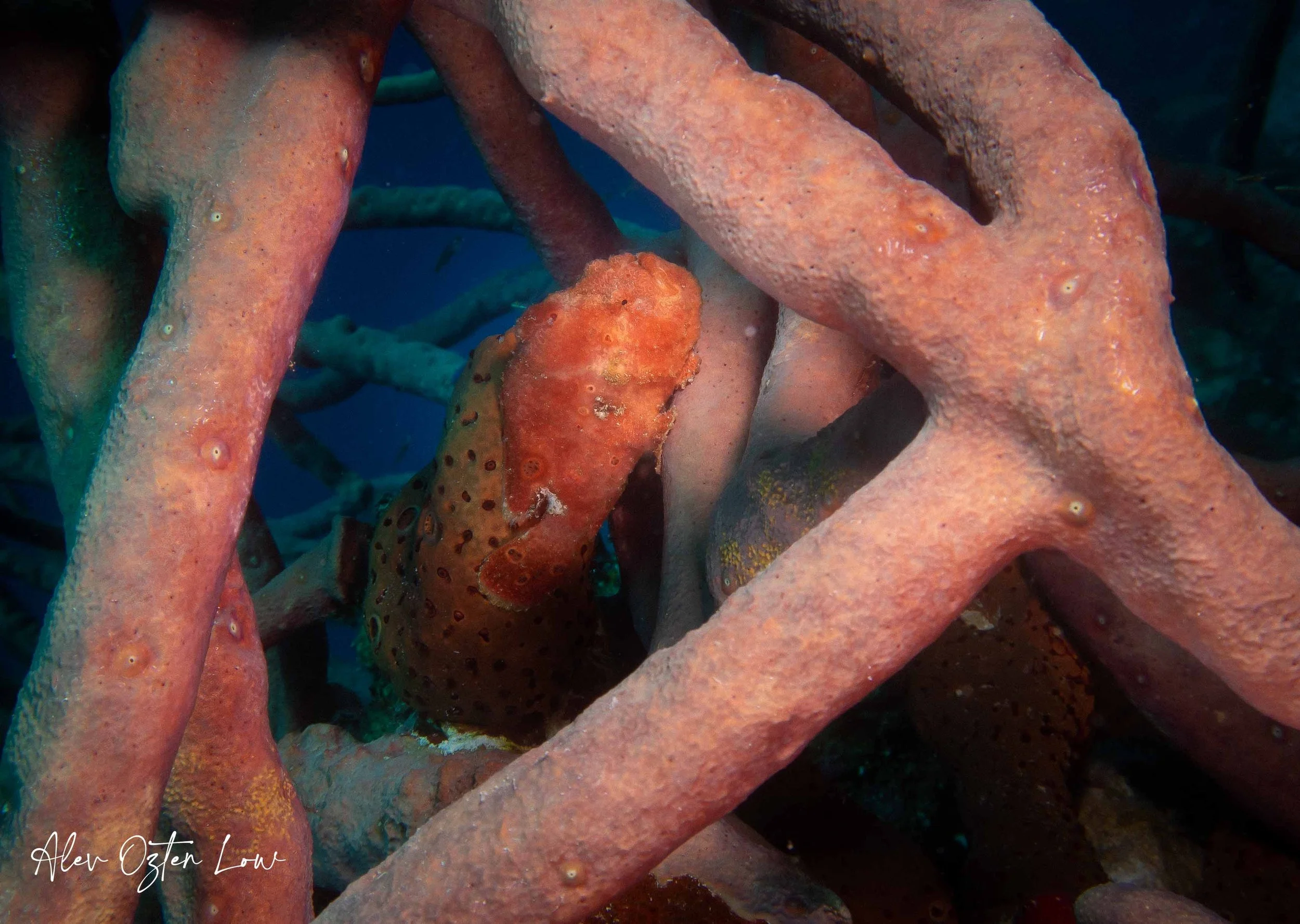 Longlure Frogfish PAIR (Antennarius multiocellatus) - Can you see them both? The male (smaller on the right) followed the female (pink large one) for quite some time. WATCH VIDEO ON YOUTUBE