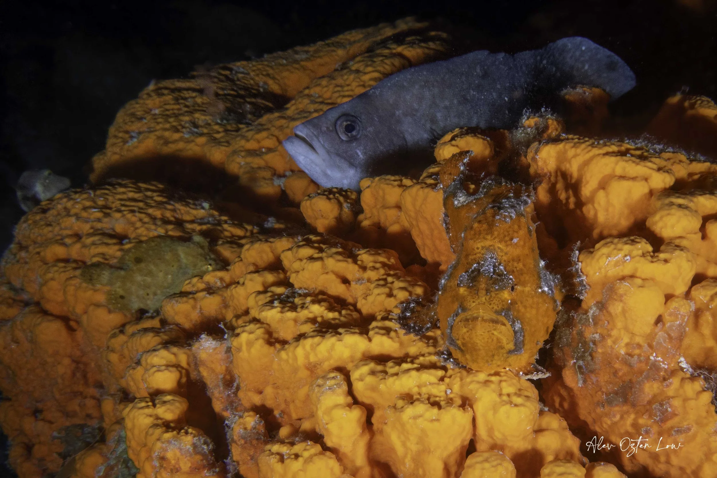Longlure Frogfish (Antennarius multiocellatus) pair. - 3 is a crowd: Greater Soapfish butting in :)
