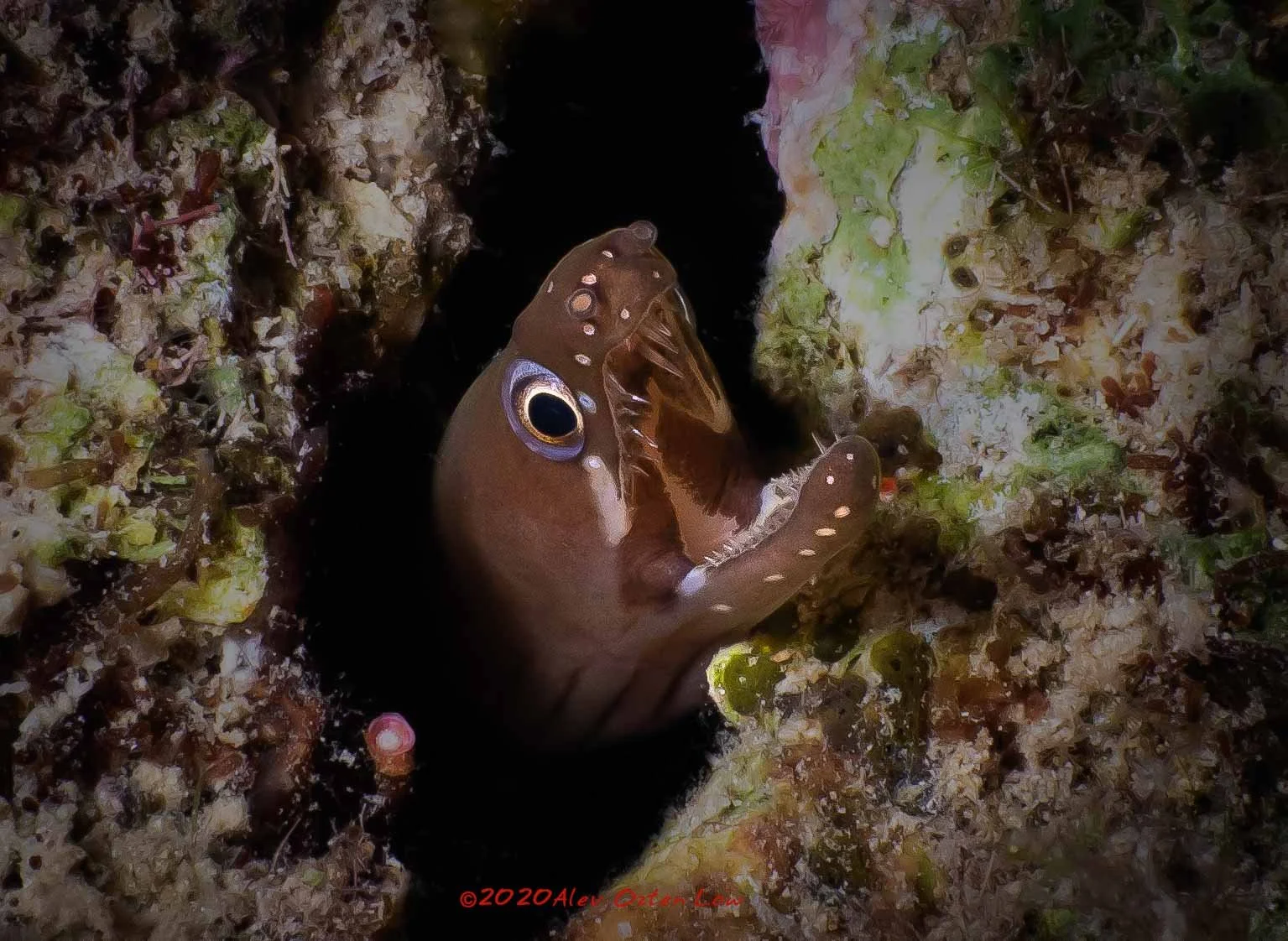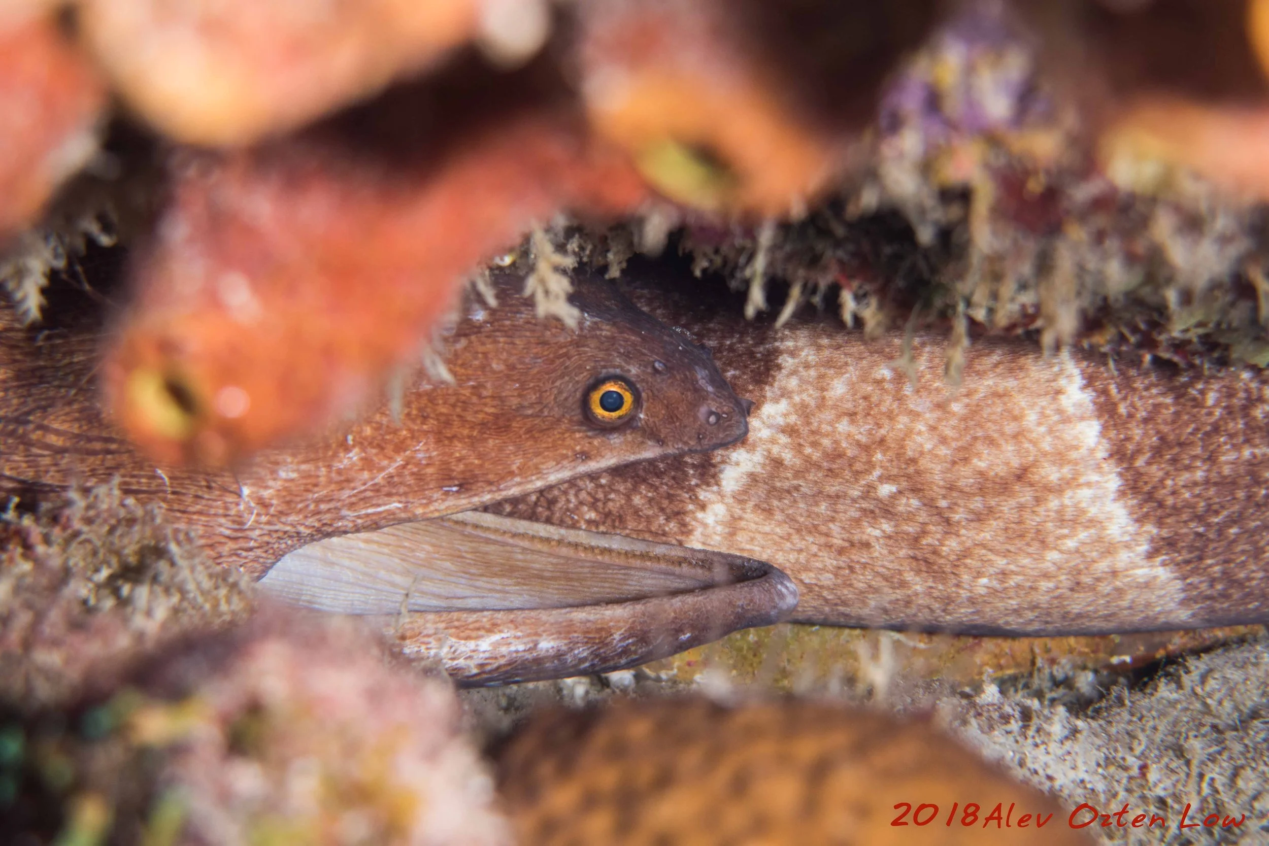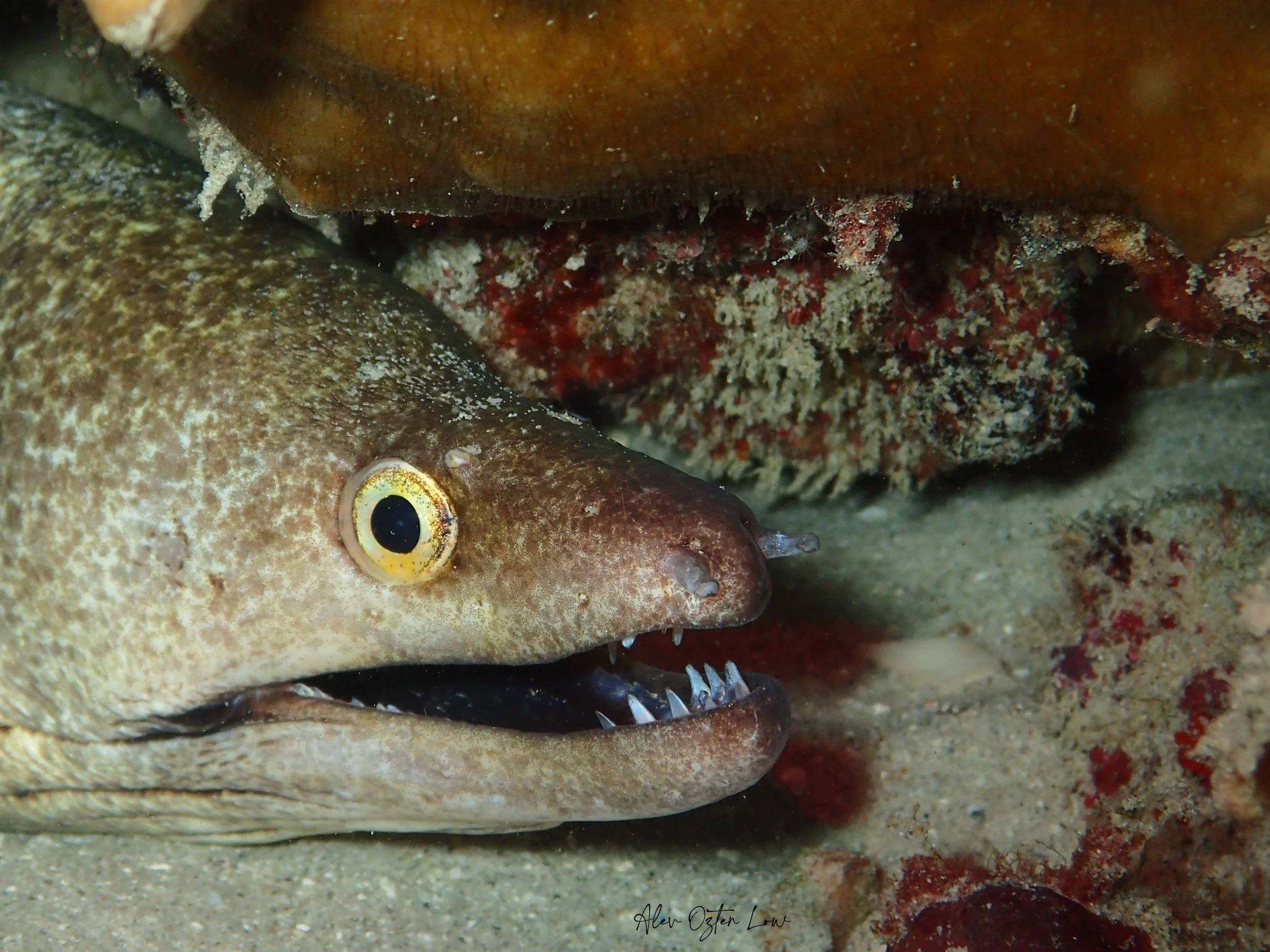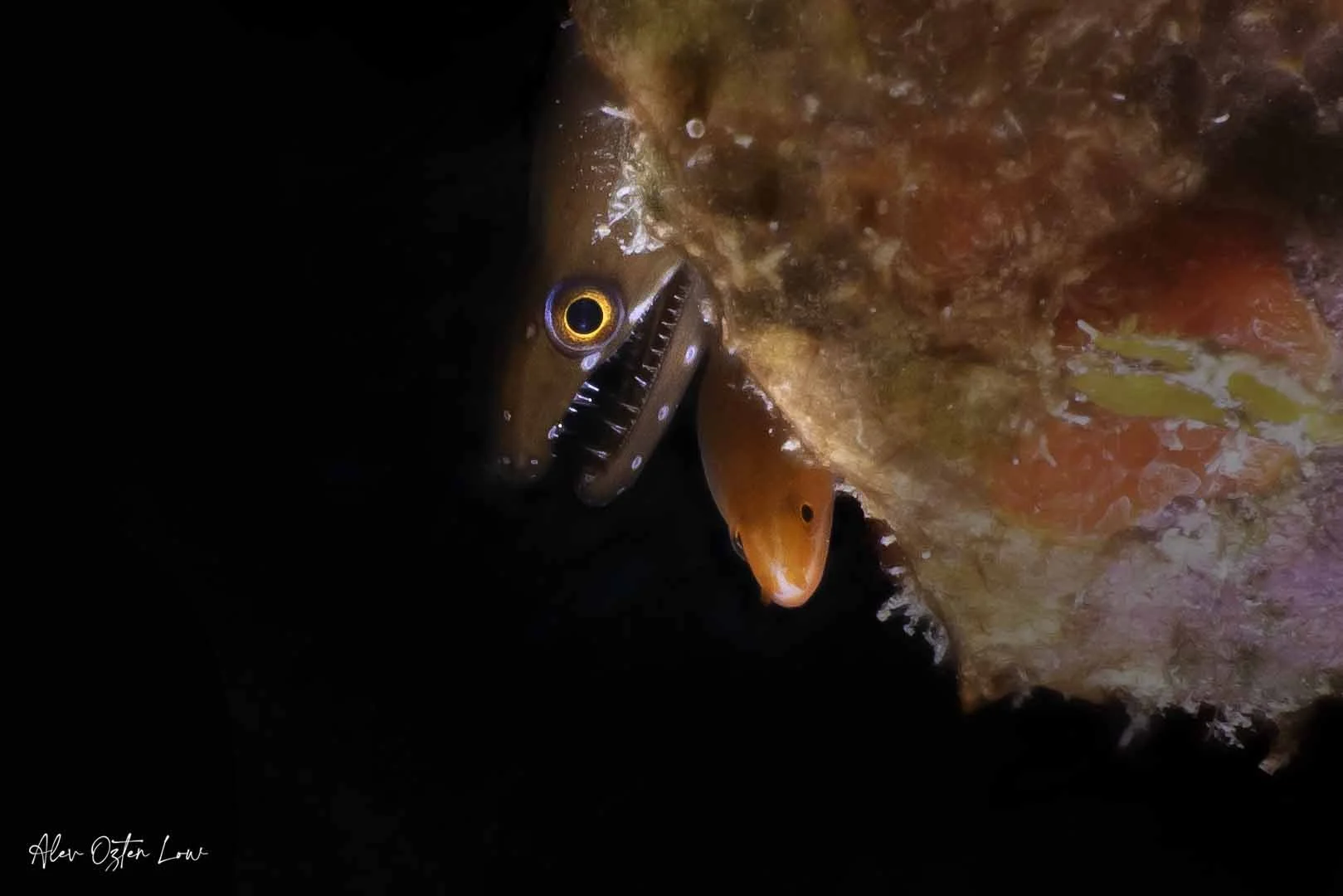 Chestnut Moray (Enchelycore carychroa) photo bombed by Redface Moray (Monopenchelys acuta)