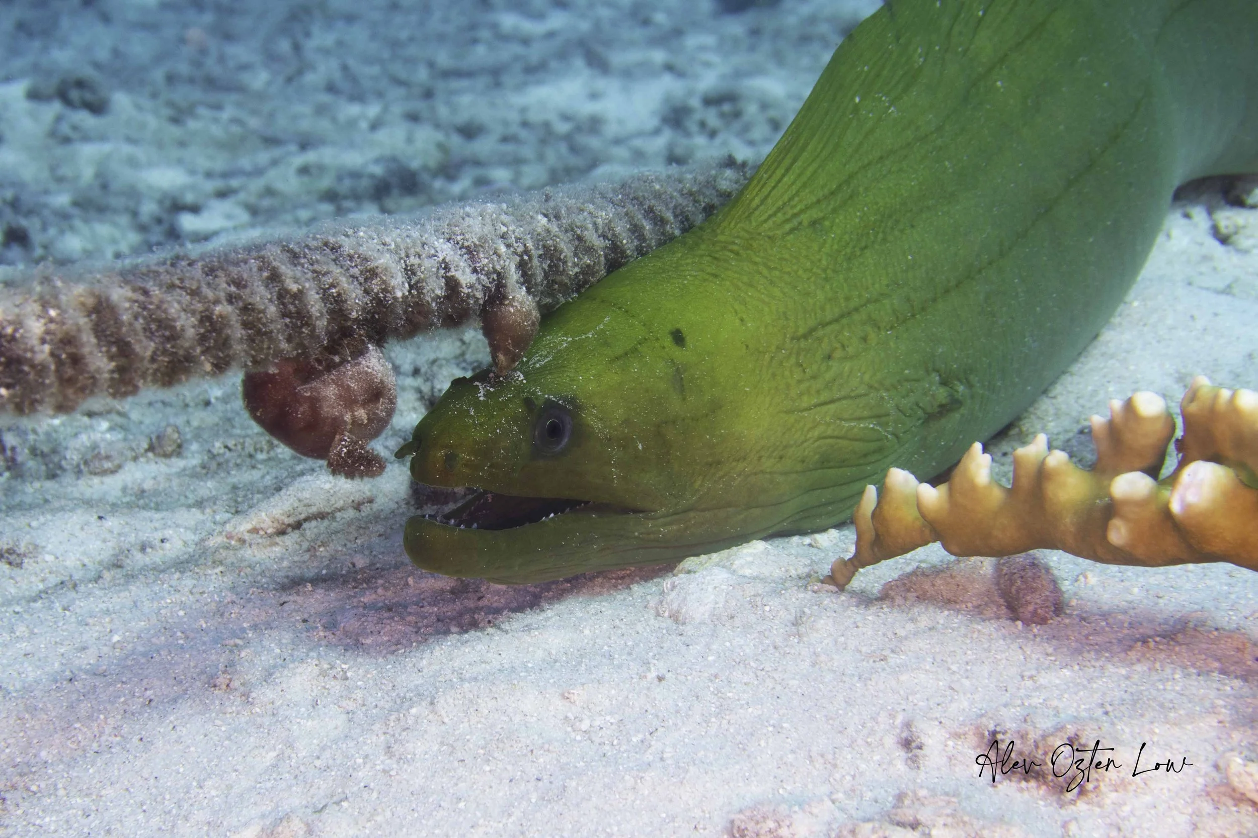Green Moray (Gymnothorax funebris) with Cubera Snapper