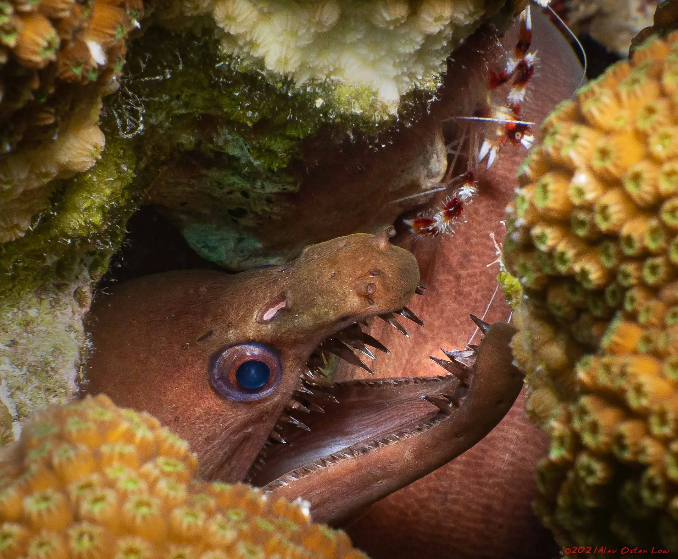 Viper Moray (Enchelycore nigricans) with cleaner shrimp